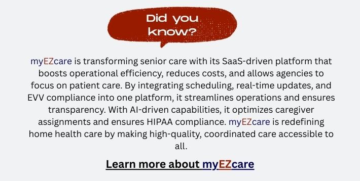 myEZcare offers a comprehensive home care solution that integrates homecare apps with EVV compliance, real-time updates, and seamless communication tools. Our platform automates scheduling, ensures accurate visit verification, and keeps clients and caregivers informed, reducing administrative burdens. With myEZcare, home health agencies can improve operational efficiency, boost caregiver satisfaction, and enhance client engagement, all within an easy-to-use system.